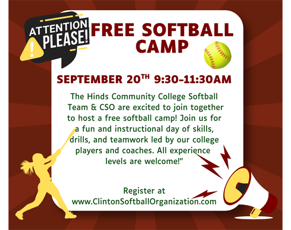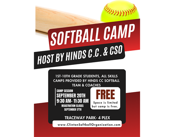 📣 FREE Softball Camp! Completely FREE!Join us for the Hinds CC Softball Camp — open to girls in 1st–10th grade of all skill levels!📍 Traceway Park – Clinton, MS📅 September 20th Skills training, fun drills, and college-level coaching!Don’t miss out — bring your glove and get ready to play!